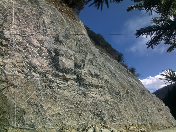 邊坡柔性防護系統(tǒng)是以高強度柔性網(wǎng)(菱形鋼絲繩網(wǎng)、環(huán)形網(wǎng)、高強度鋼絲網(wǎng))作為主要構(gòu)成部分,并以覆蓋(主動防護)和攔截(被動防護)兩大基本類型來防治各類斜坡坡面地質(zhì)災(zāi)害和雪崩、暗破沖刷,爆破飛石、墜物等危害的柔性安全防護系統(tǒng),它是一種集構(gòu)件設(shè)計和加工、系統(tǒng)配置設(shè)計與定型、現(xiàn)場設(shè)計類型、現(xiàn)場布置與施工設(shè)計的系統(tǒng)化技術(shù)。公路邊坡柔性防護系統(tǒng)具有很大的推廣應(yīng)用和前景。