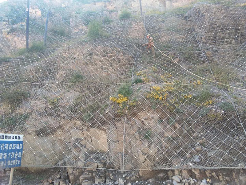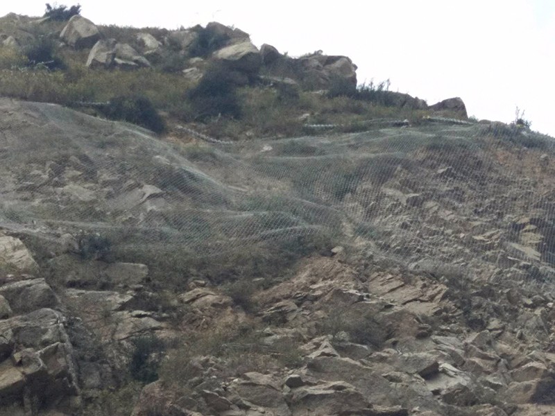 主動防護系統(tǒng)采用高強度熱鍍鋅鋼絲繩、鋼絲網(wǎng),不低于AB級的防腐處理,其防腐壽命根據(jù)環(huán)境條件的不同一般可達30-50年。主要對邊坡失穩(wěn),潛在擴離落石危險的坡面進行防治,以縱橫交錯的ф16支撐鋼繩,按坡形(4.5X4.5m或4.8X4.8m)方形模式布置成網(wǎng)柜,并于4X4m的主動網(wǎng)用縫合繩進行預(yù)張拉,使該系統(tǒng)對坡面施以一定的方向預(yù)緊壓力,從而提高危巖體的穩(wěn)定性,阻止落石的發(fā)生,同時該系統(tǒng)不會影響地下水的正常排泄,并給邊坡的生態(tài)治理提供了先決條件。